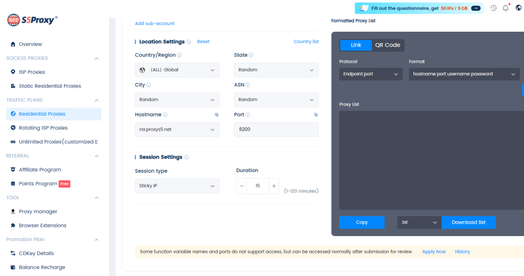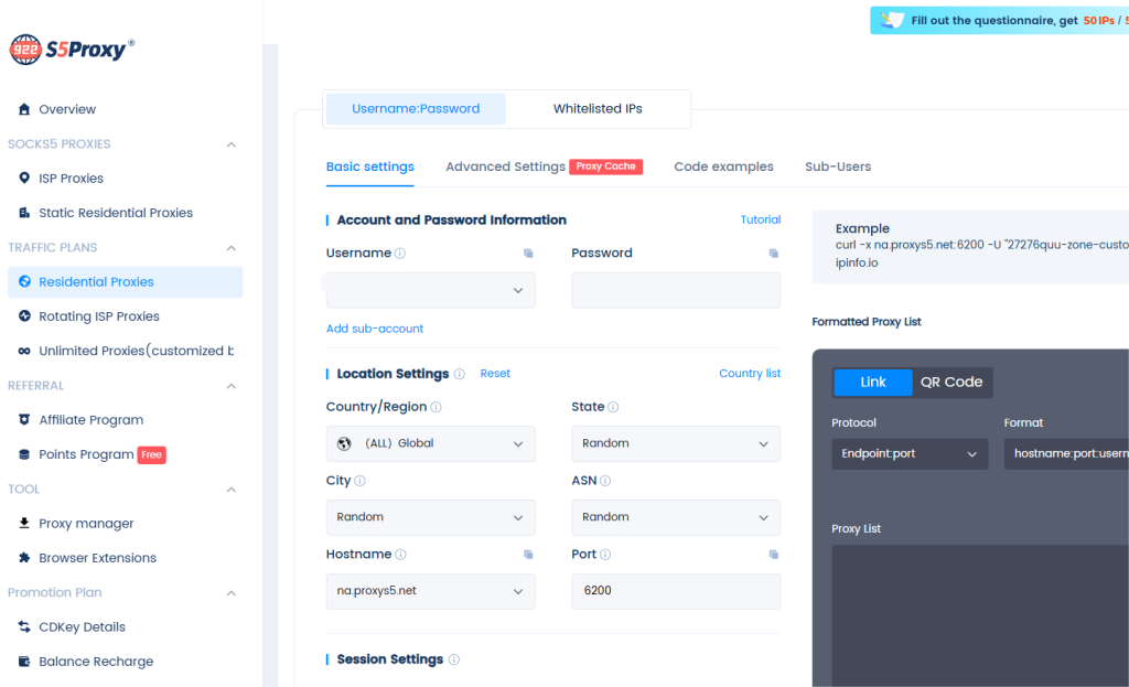 Filter proxies by country or city. Click “Personal Center” – “Residential Proxies” – “User Password Authorization” to enter the page. Set the country/region, city, session type (sticky/random), user name (you can choose the main account or sub-account) and other conditions according to you need.